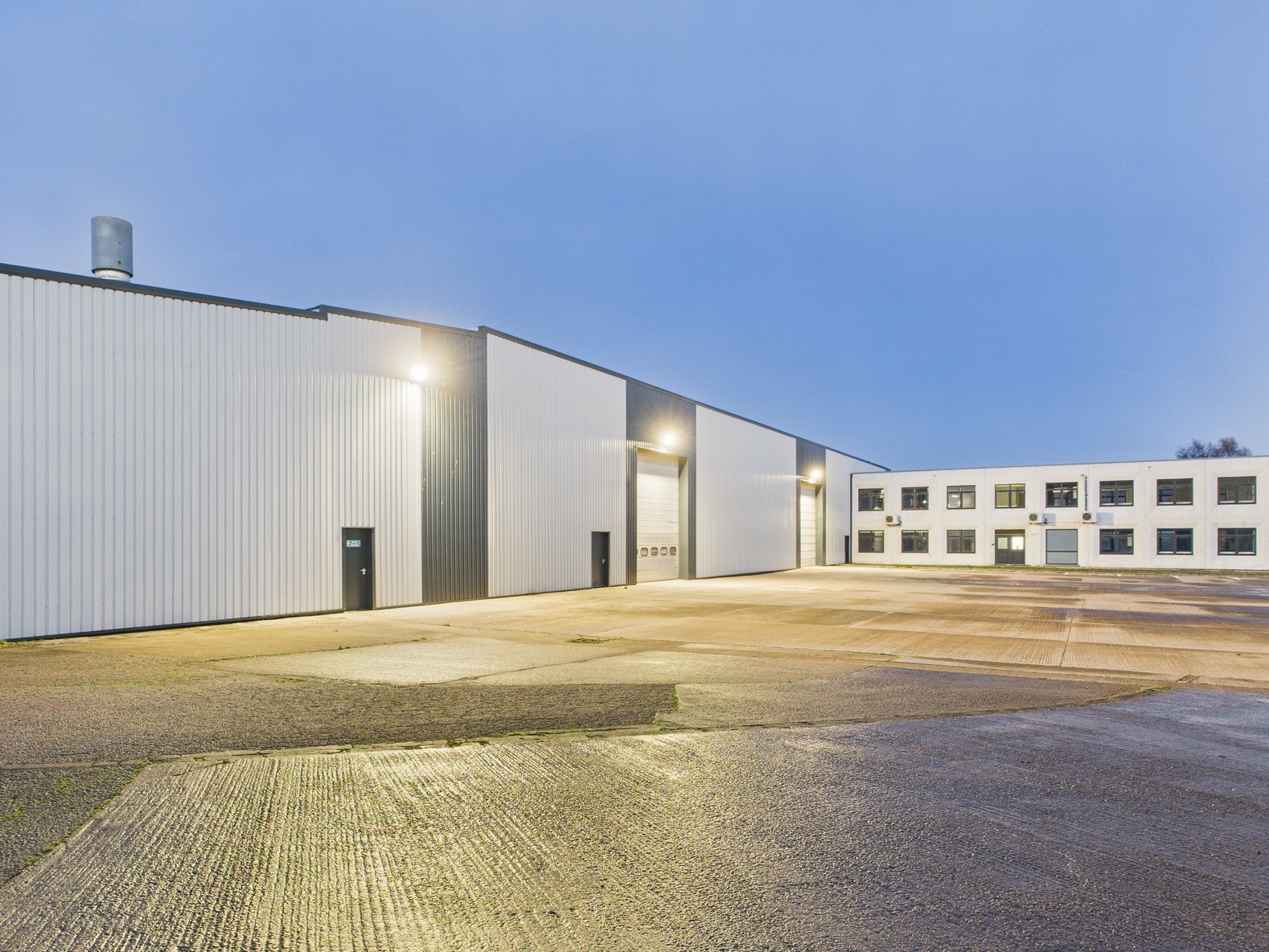 The main industrial unit is of a steel portal frame construction with blockwork walls to dado height and profile metal cladding thereafter.