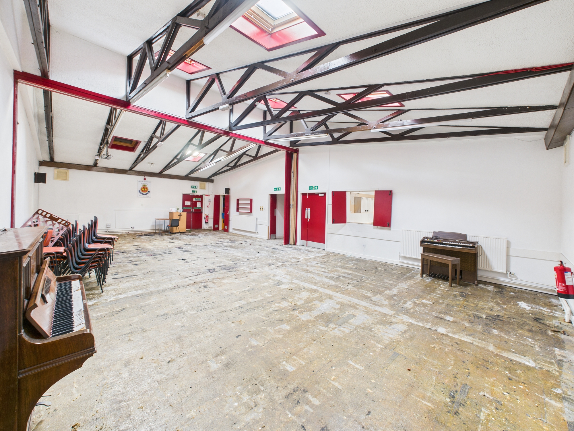 Internally, the subjects consist of accessible W/C provisions, as well as two large office/storage spaces. A commercial kitchen can be found to the left and services the large, open-plan space to the rear of the property. The large hall to the rear benefits from a sliding partition wall running through the center as well as high levels of natural light from skylights in the ceiling.