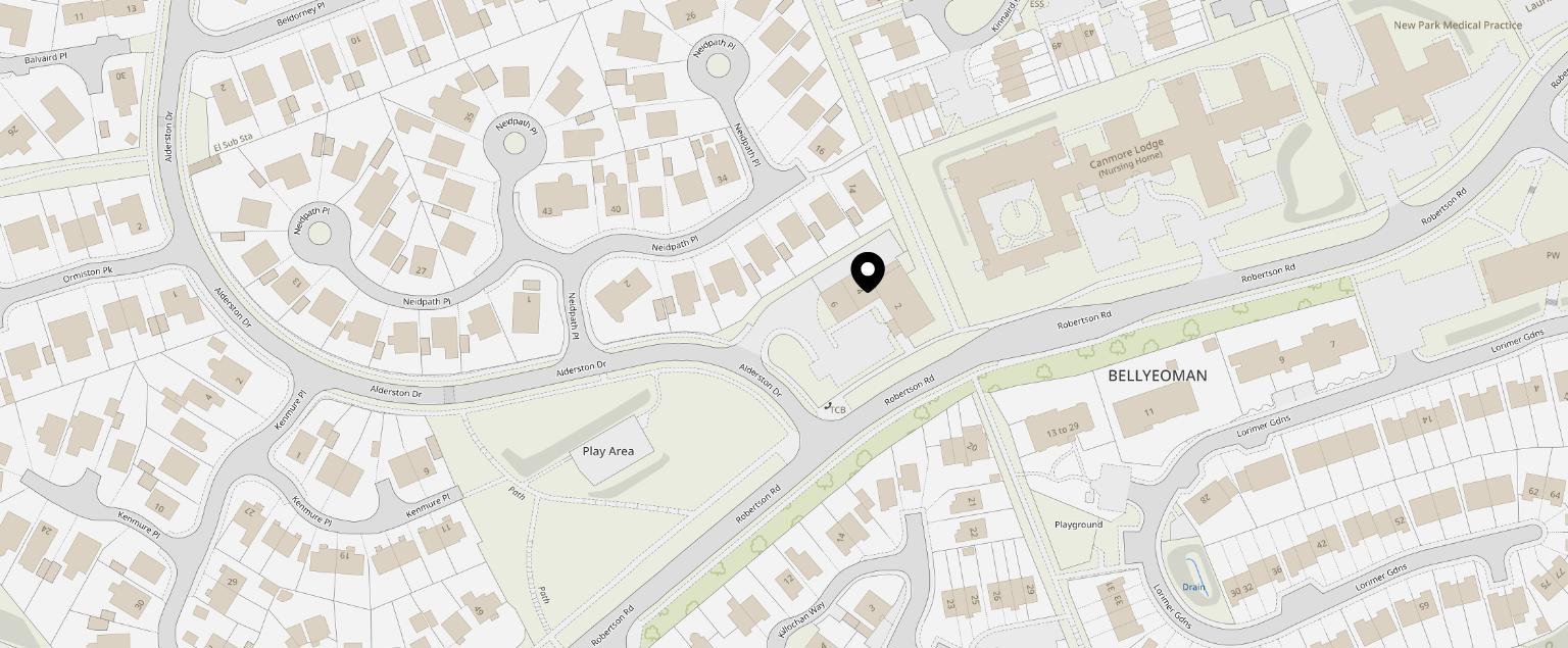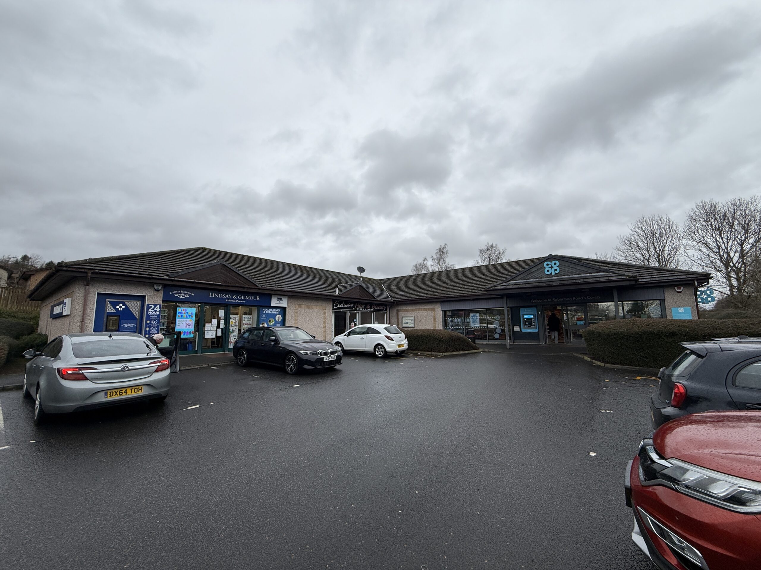 Adjacent to Co-Op local supermarket and Lindsay and Gilmour Pharmacy.
