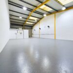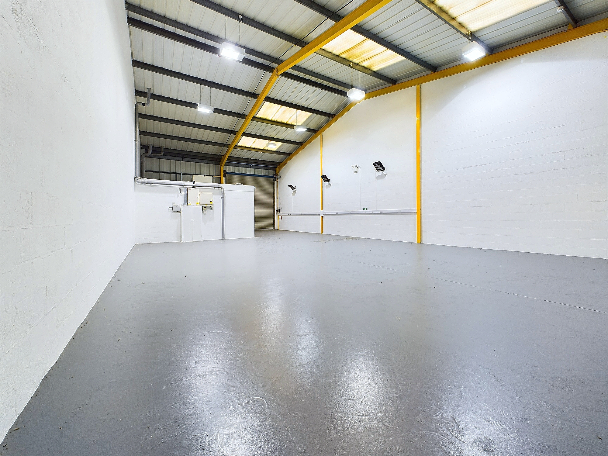 The warehouse flooring is concrete with the walls and roof being to the inside face of the brick work and cladding respectively. Artificial lighting is provided by LED or high bay sodium fitments