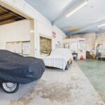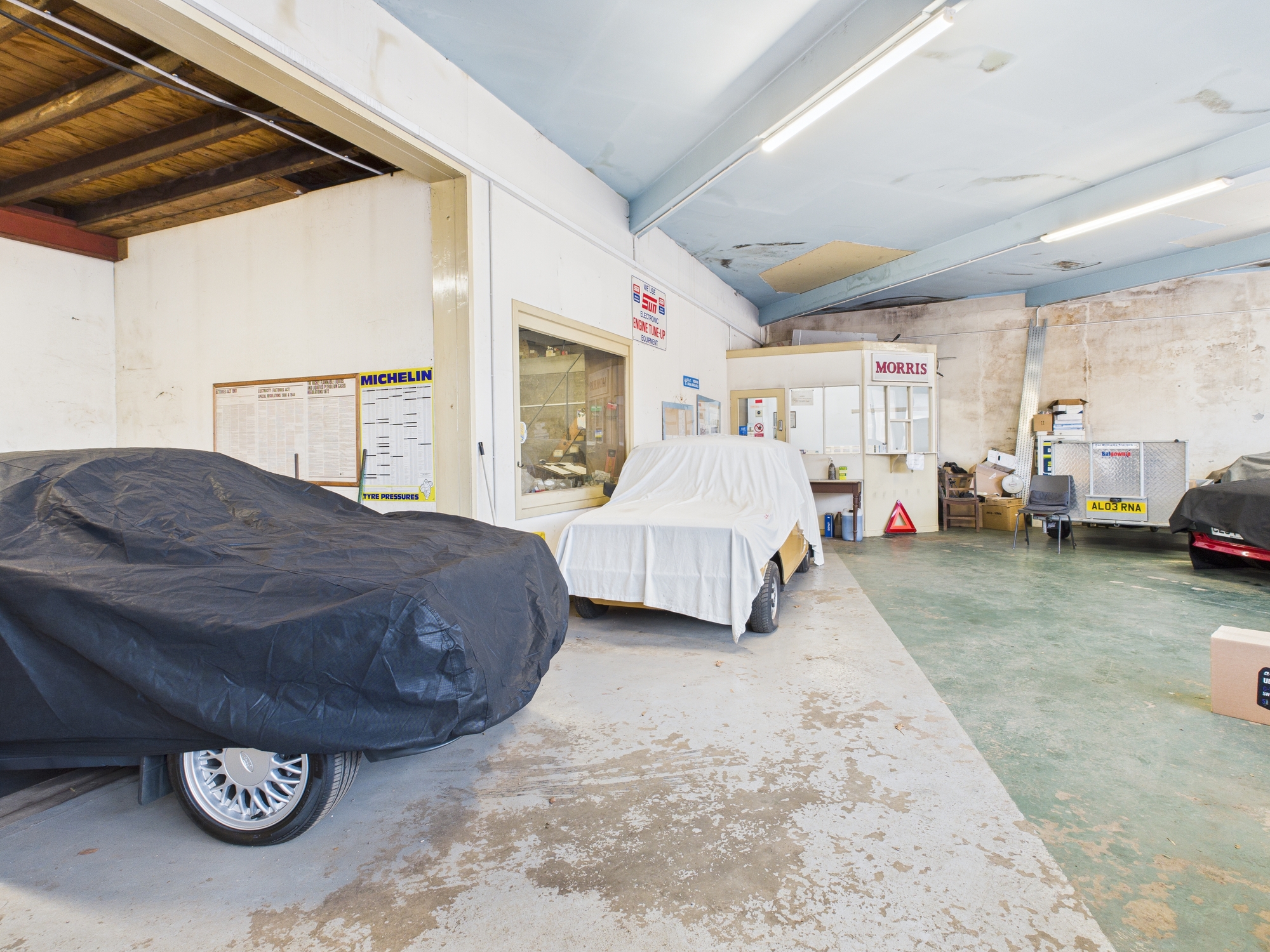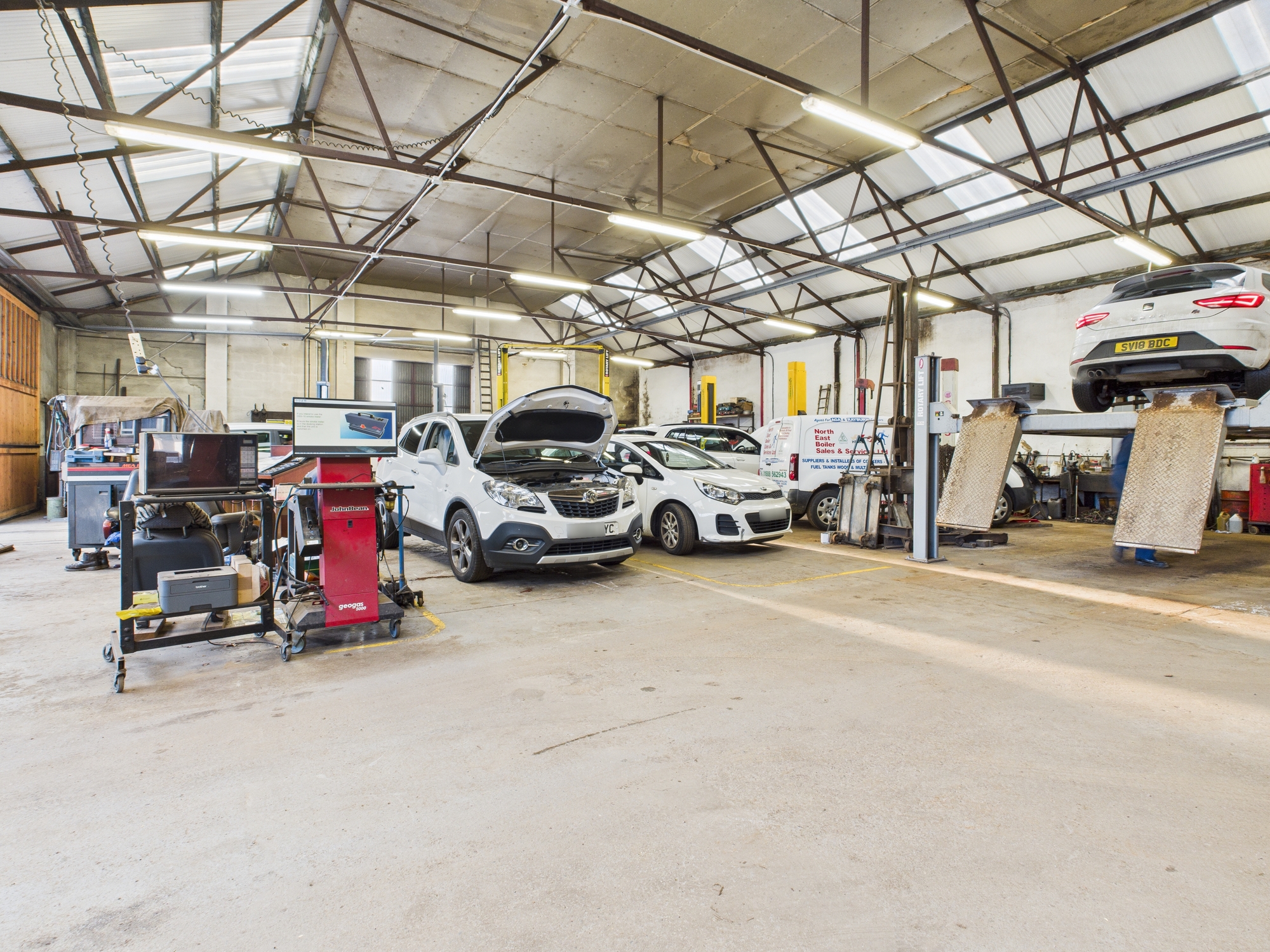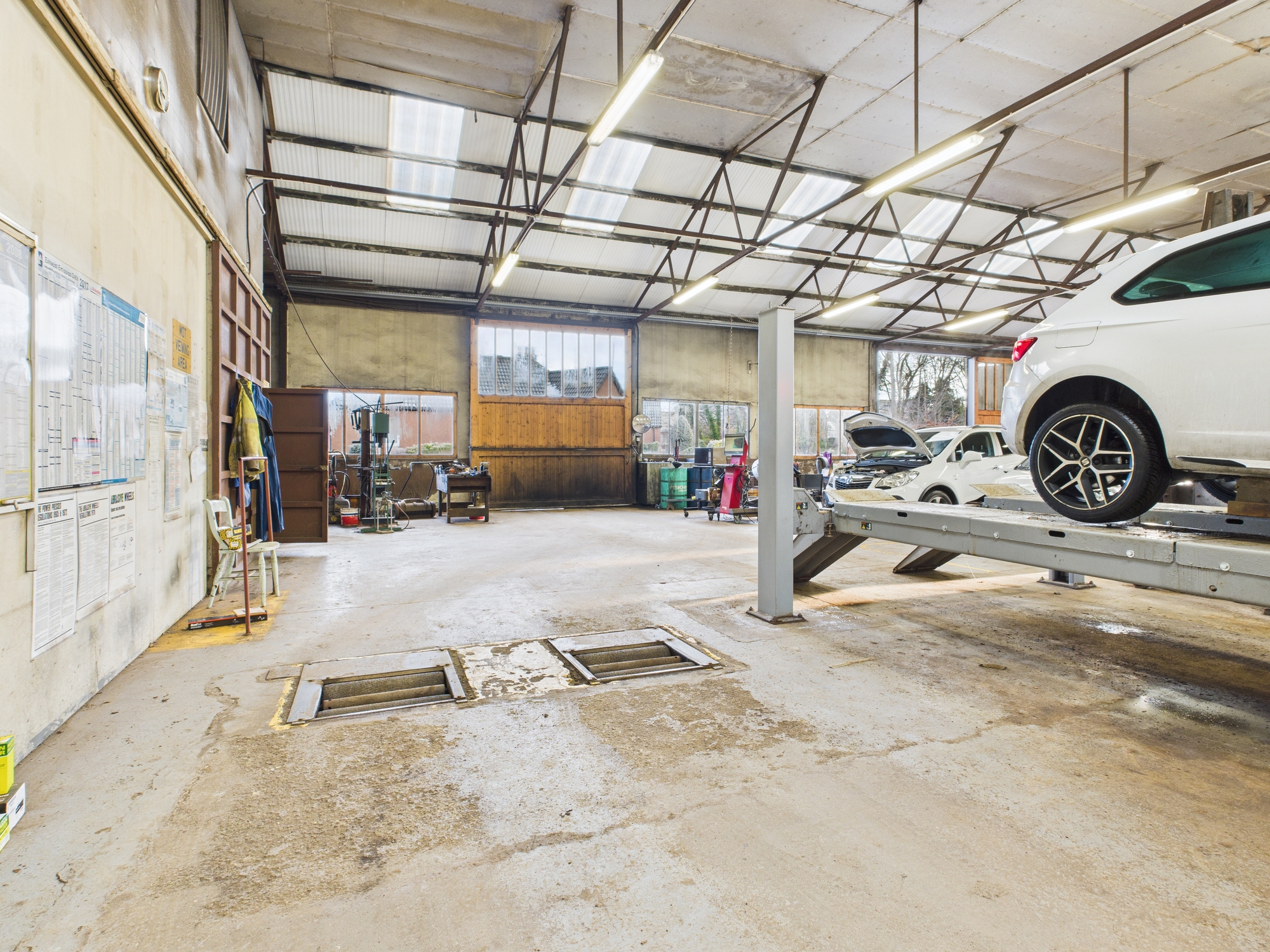 The main workshop has a painted solid concrete floor, walls open to the inside of painted blockwork, with the ceiling open to the underside of the metal