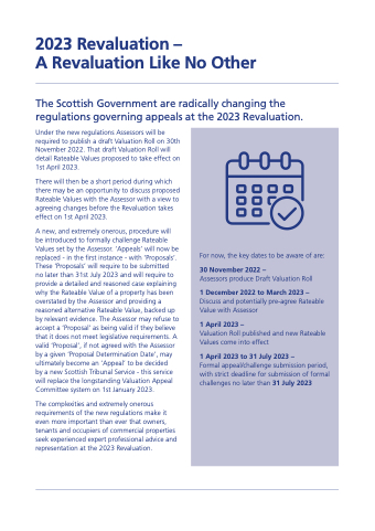 by a a new Scottish Tribunal Service - this service will replace the longstanding Valuation Appeal Committee system on 1st January 2023 The complexities and extremely onerous requirements of the new regulations make it even more important than ever that owners tenants and occupiers of commercial properties seek experienced expert professional advice and representation at at at the 2023 Revaluation For now the key dates to be aware of are: